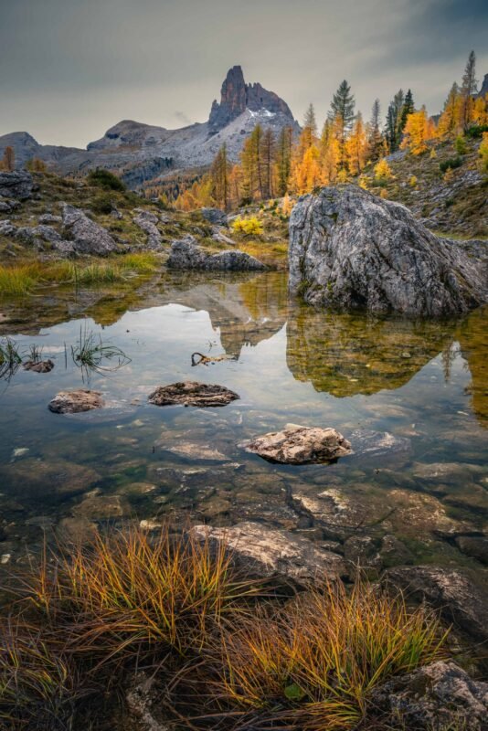 Lago Fedèra is een sereen alpenmeer, omringd door lariksbossen die in de herfst een schitterende gouden kleur aannemen. Deze plek biedt een rustige sfeer die perfect is voor sfeervolle en reflectieve foto’s. De wandeling ernaartoe is een van de mooiste van de Dolomieten.