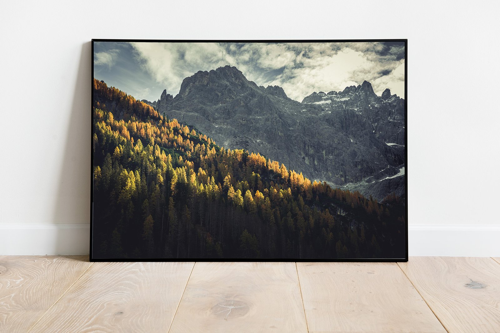 Laat je meevoeren door de kracht van Eclipse – een fine art print die het dramatische spel van licht en schaduw in de bergen vastlegt. Gouden herfstbomen lichten op tegen een donkere rotswand, terwijl wolken en contrasten een mystieke sfeer creëren. Een kunstwerk dat monumentaliteit en poëzie combineert.