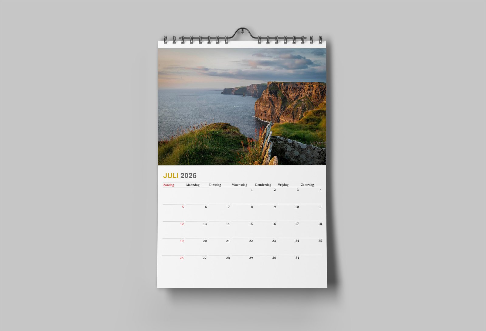 De Ierland Fotokalender 2026 is gedrukt op stevig, hoogwaardig papier waardoor de beelden prachtig tot hun recht komen. Het A4 staande formaat (21 × 29,7 cm) past in vrijwel elk interieur en maakt het eenvoudig om afspraken en notities te plaatsen. Bovendien zijn de foto’s zo mooi dat je ze na afloop van het jaar kunt uitsnijden en inlijsten.