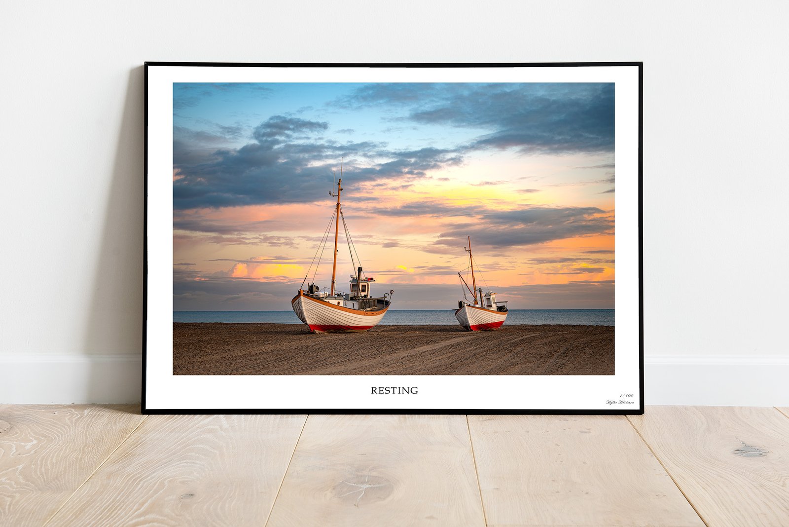 Laat je meevoeren door de serene schoonheid van Resting – een fine art print die twee traditionele vissersboten vastlegt, rustend op het zand van het strand in noord Denemarken. De warme gloed van de opkomende zon weerspiegelt in de wolken en de zee en creëert een tijdloze balans tussen kleur en sfeer. Een beeld dat stilte, traditie en de stille verwachting van een nieuwe dag oproept.