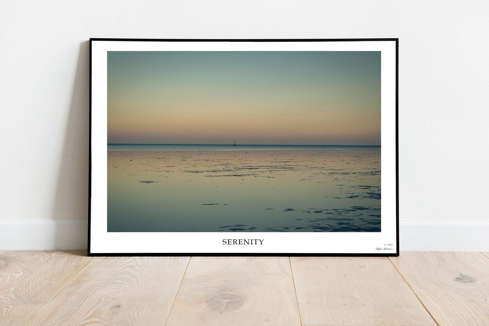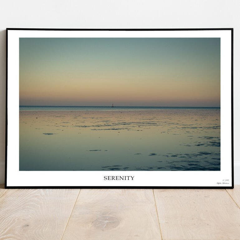 Laat je omhullen door de verstilde schoonheid van Serenity – een fine art print die de kalmte van zee en horizon in zachte pastelkleuren vastlegt. Het subtiele spel van licht en reflectie maakt dit een tijdloos kunstwerk dat rust en balans brengt in elk interieur.